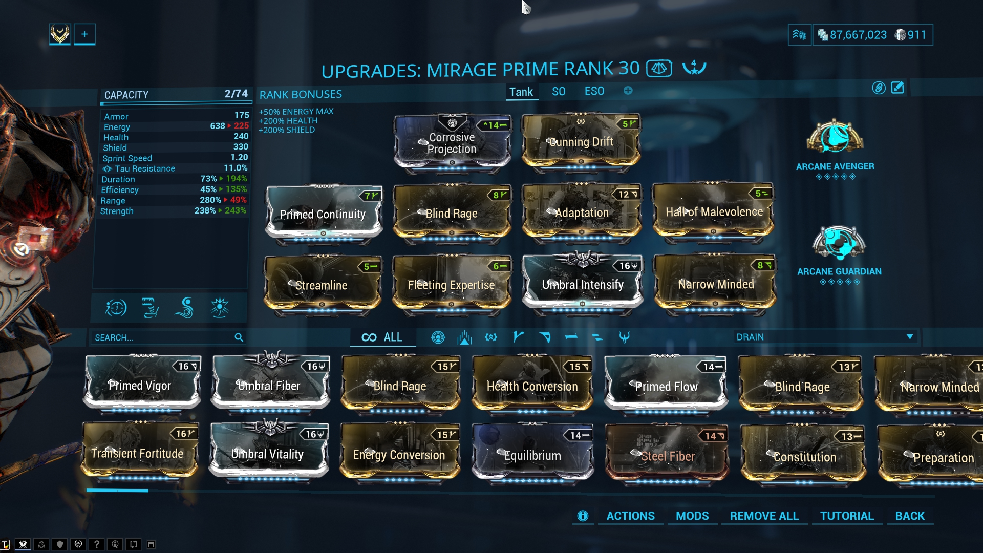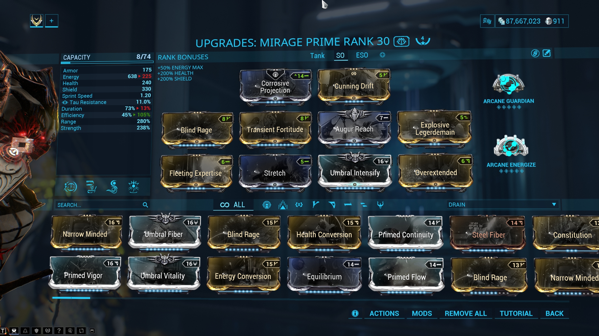 The perfect build for ESO runs. Due to the high energy pool available you don't need much Ability Efficiency and Duration. Strength and Damage is what you need to cover a very large area of the map. When enemies die they drop pickups which then again can be turned into traps. The "Explosive Legerdemain" Augment further increases the amount of damage you do this way. This build also works for all other missions where waves of enemies are spawning or endless missions. It scales well till ~level 100. Above that you probably should go for the tank build.
