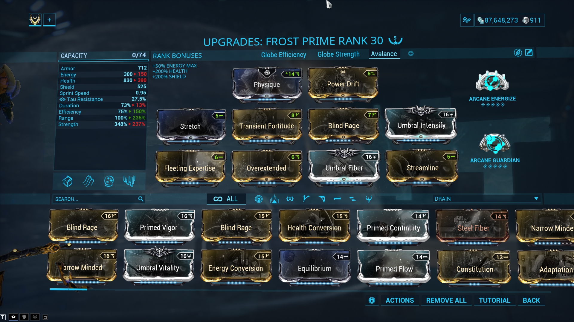 The Avalanche build is a compromise between Ability Strength, Efficiency and Range. You of course want to cause damage to enemies in a larger area so range is important here. You also might have to cast this ability quiet often so you need the Efficiency. Here Frost would work as a debuff and support Warframe on higher difficulties and damage dealer on lower difficulties.
