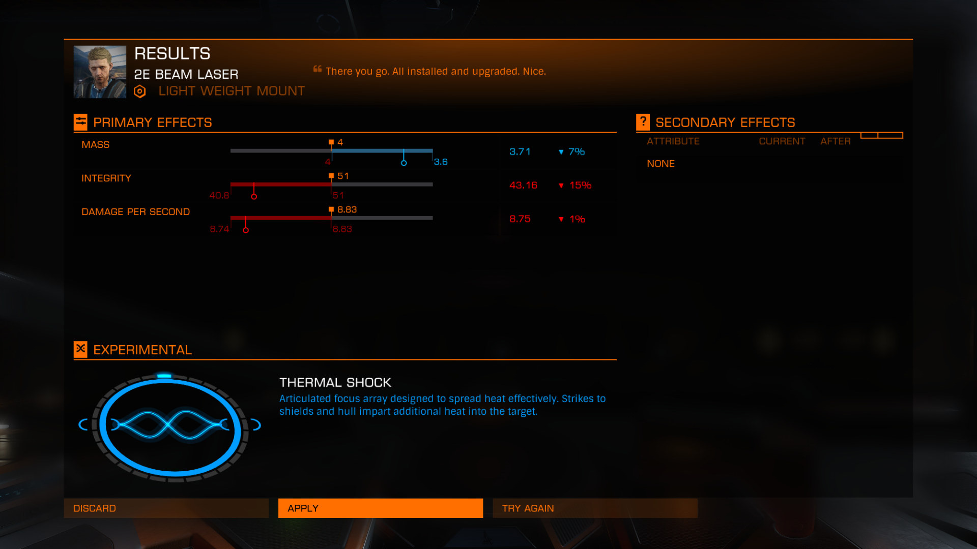 Each module/weapon can have ONLY ONE upgrade/time and ONLY one special effect if you are lucky enough to get it. It can be, that if you are lucky and get experimental effect, it will be much more beneficial for you as changed item stats. In current case I only used easy modification for rise my reputation with given engineer. It was lucky draw, updating uses RNG so you may need more attempts to get experimental effect. More cmdrs hates such RNG mechanism, but myself see it make perfect sense that you cannot get perfect stats or acquire special effect easily. Engineering is run on long track, if you want to get updates quickly and on maximum, you can fall into heavy grind and get seriously upset on RNG ... but in ED its common, is UP TO YOU DECIDE what you want to do and YOU WILL NEED dealt with your decisions consequences. ... myself prefer do slow progress from time to time and not aim for "perfect" results at all costs. It helps me avoid grinding and I have much more fun when play ED.