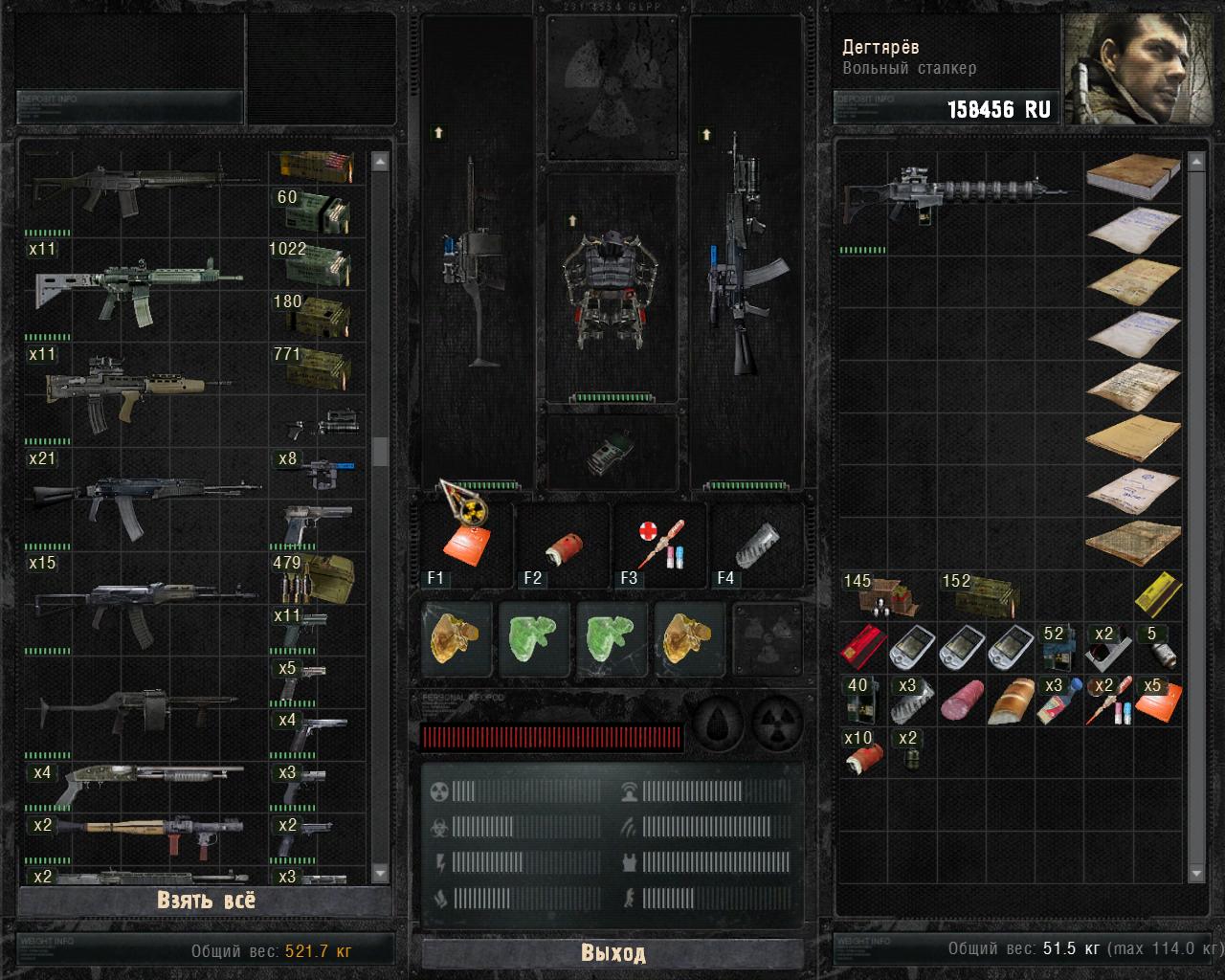 Note that all the guns in the personal locker are in top condition. As you reach Pripyat, the military mechanic repairs all damaged weapons and equipment for free, even if it's not even sellable to dealers. Originally meant to ease player's travel through Pripyat, however it is possible to have Degtyarev (the player character) and said mechanic cooperating in order to ruin the gun trade in the Zone via market inflation.