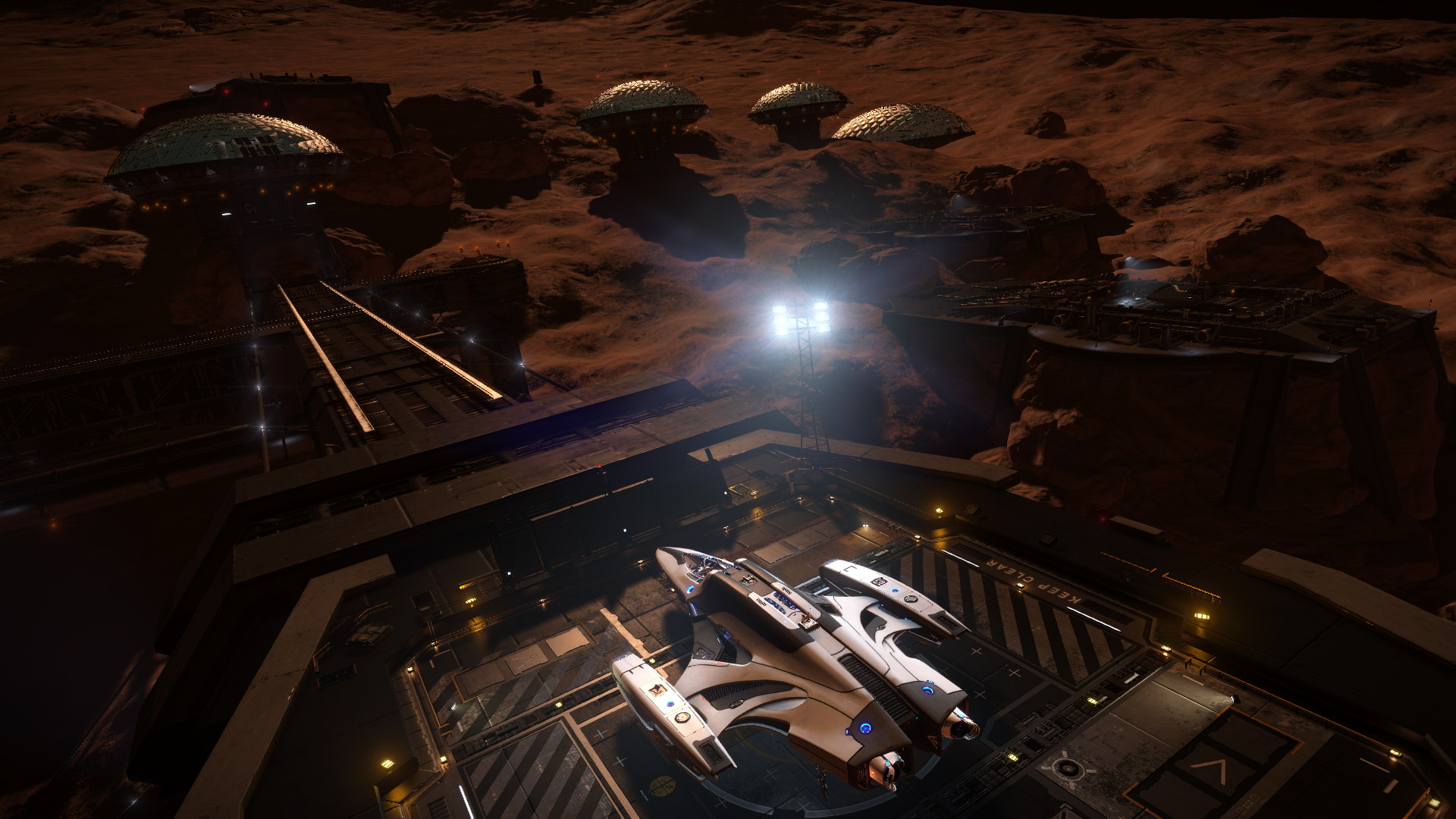 On engineering trip. This special engineer base have quite interesting unusual landing pads, which looks like high tower ... reminds the stork's nest. Alas camera limitation (in ED 2.2) do not allow take better (more distant) screenshots. This should significantly change in ver. 2.3 which is almost around the corner (release next week).